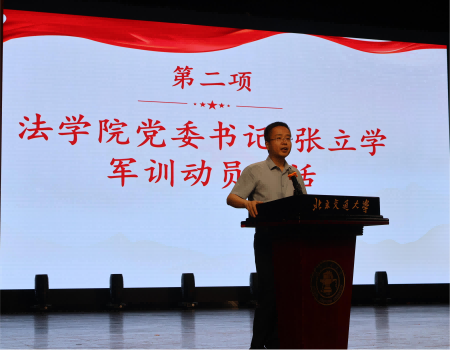 在奏唱国歌的仪式中,大会正式拉开了序幕。张立学首先发表了军训动员讲话,他深入阐述了大学生军训的重大意义,不仅关乎党和国家的全局需要,更是加强国防后备力量建设、培养大学生爱国情怀的重要途径。同时还对参训学生们提出了殷切希望,一是希望同学们提高国防意识,秉持家国情怀,内化修法明德,弘毅济世的院训精神;二是希望同学们严格要求自己,养成良好习惯,展现出法学学子的良好形象;三是希望同学们团结协作,捍卫集体荣誉,不抛弃不放弃。