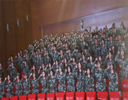 之后,全体参训学生进行宣誓,慷慨激昂的誓言在会场内回荡,彰显了他们对军训纪律的庄严承诺和奋发向上的决心。