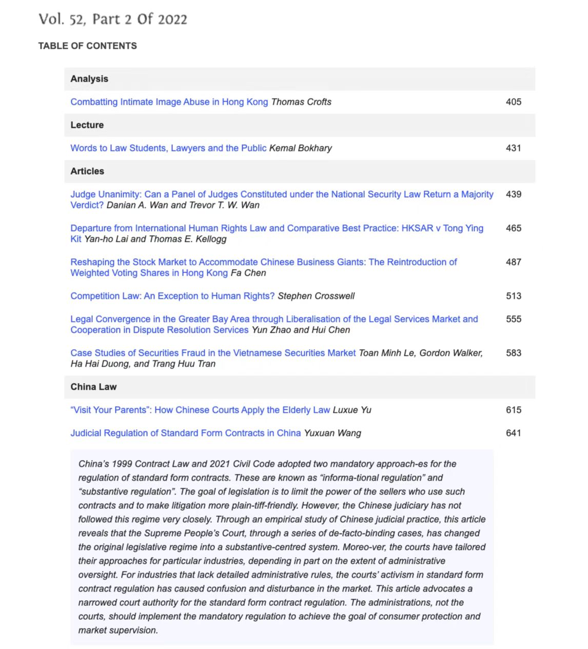 《Hong Kong Law Journal(香港法律学刊)》近期刊发了麻豆 教师王俣璇的论文《Judicial Regulation of Standard Form Contracts in China(中国格式条款的司法规制)》。