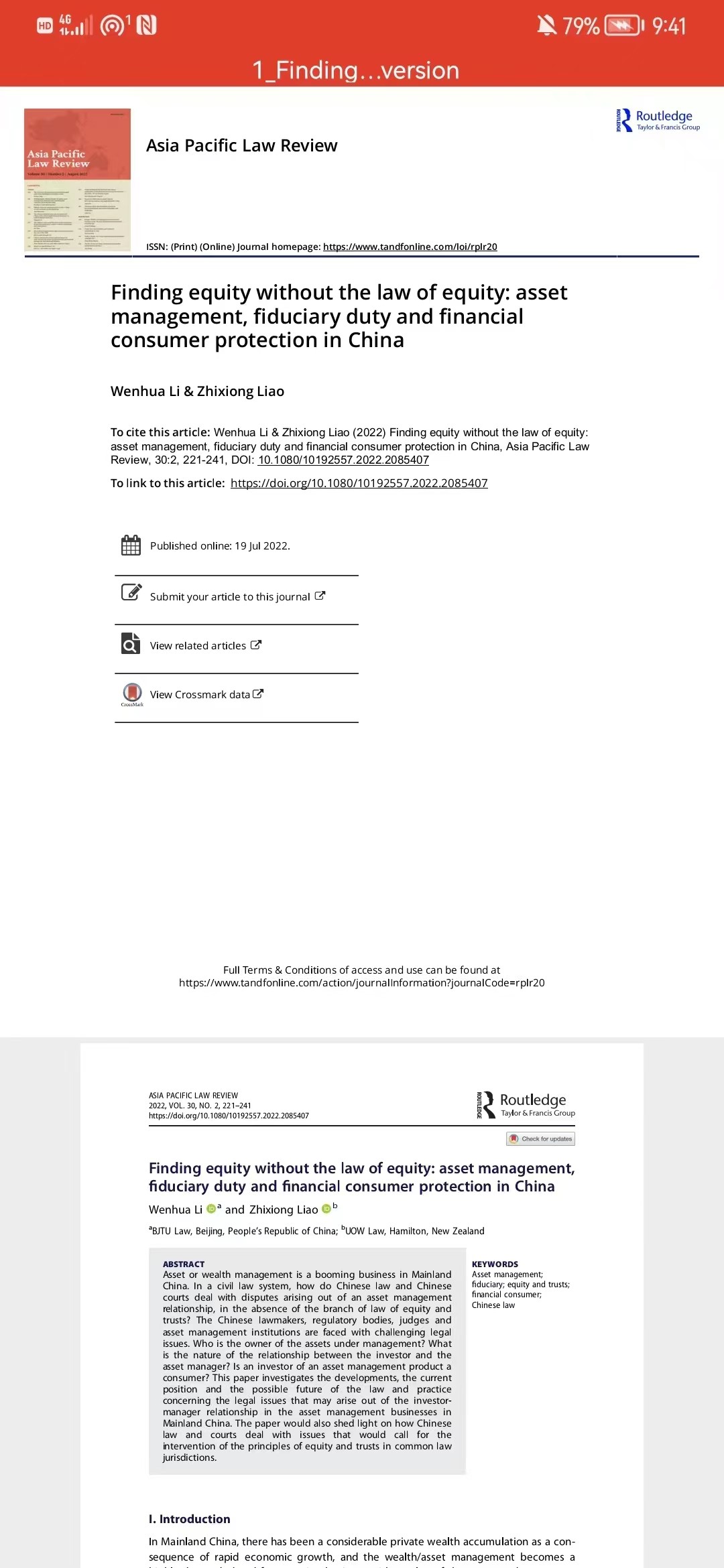《Asia Pacific Law Review(亚太法律评论)》近期刊发了麻豆 副教授李文华老师和新西兰怀卡托大学麻豆 教师廖志雄博士合撰的论文《Finding Equity without the Law of Equity: Asset Management, Fiduciary Duty and Financial Consumer Protection in China(在没有衡平法的情况下寻找衡平:中国的资产管理、信义义务与金融消费者保护)》。