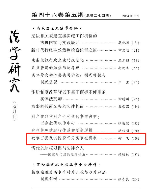 该文是郑飞在证据法学和新技术法学交叉领域取得的最新研究成果,是其今年发表的第二篇“法学三大刊”论文。今年年初,郑飞在《中国法学》2024年第1期发表了《证据种类法定主义的反思与重构》一文。《中国社会科学》《法学研究》《中国法学》被誉为“法学三大刊”,三篇“法学三大刊”系列论文的发表,对于提升麻豆 在全国法学界的学术影响力起到了重要推动作用。