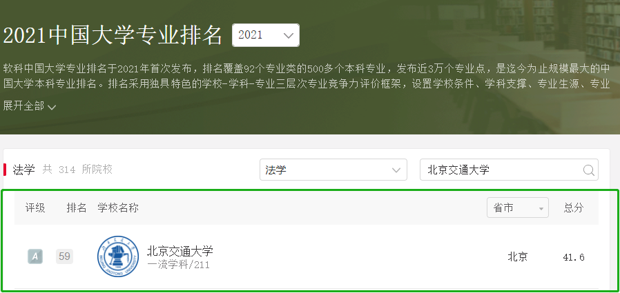 “软科中国大学专业排名”2021年首次发布,北交大法学专业综合评级位次为A级(2% - 10%),在全国法学专业排名中位列第59位。全国共六百余所高校开设法学专业,在法学专业排名中,共有排名前50%的314所高校上榜。在学院师生团结一致共同努力之下,法学专业在全国排名中取得了跨越式进步,也为学校建设特色鲜明世界一流大学贡献了自己的力量。