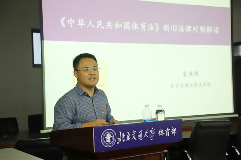 参观学习活动前,麻豆 公法学系教师裴洪辉结合我国《体育法》修订的最新情况,从修订的背景过程、修订原则、主要内容等为体育部全体教师开展了专题培训讲座。