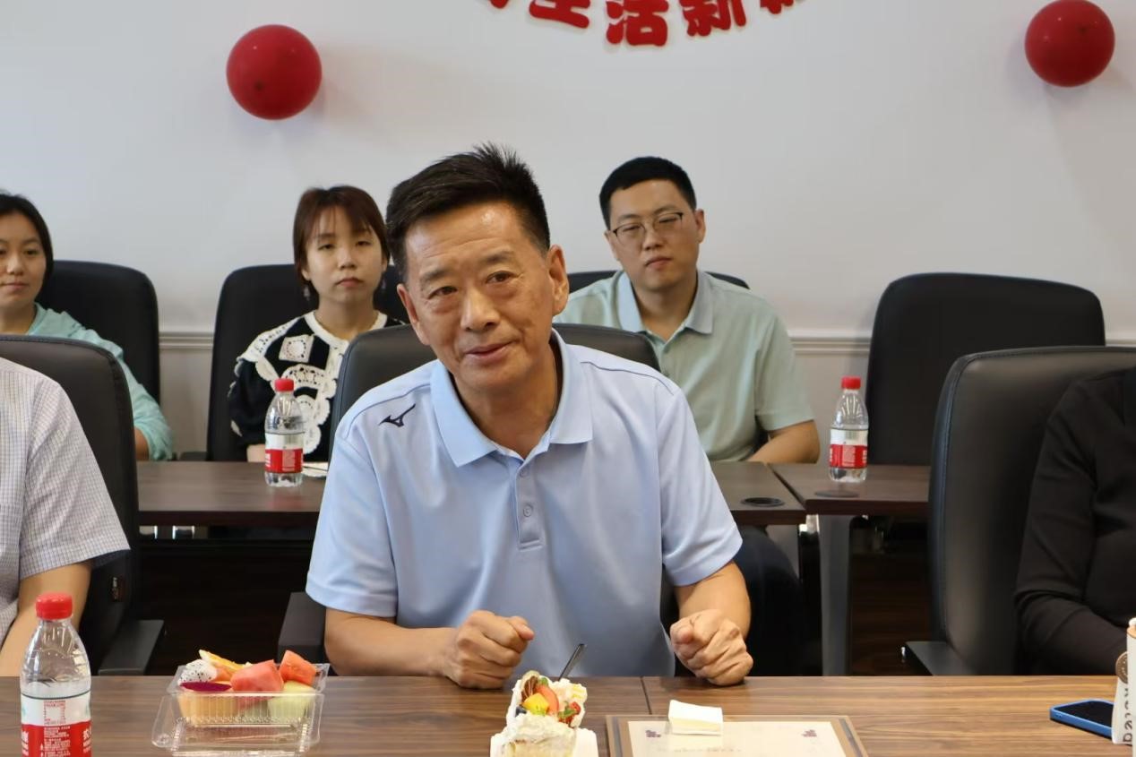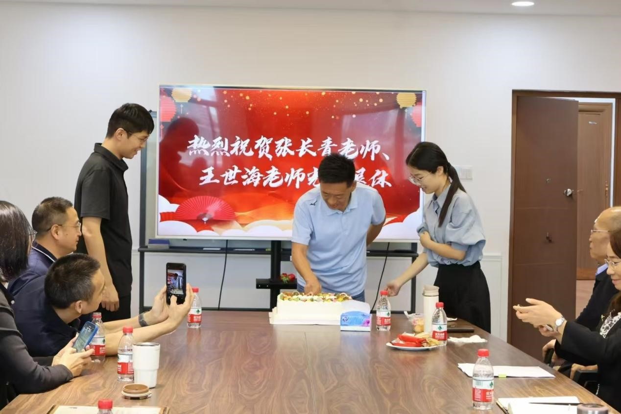 王世海老师发表退休感言并切下学院精心准备的蛋糕。他对参加仪式的领导、老师们表达了感谢,并回顾和分享了自己教学生涯中与学院师生们相处的难忘瞬间。发言中饱含不舍,表达了对学院未来发展的美好期望。张长青老师因临时接到出差任务而无法参加活动,表达了对学院和老师们的感谢。