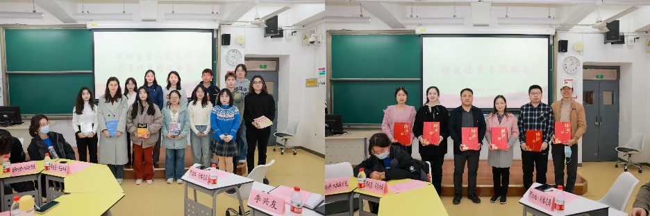 会上,与会领导为六位受聘担任少数民族学生德育导师的教师党员颁发聘书。本科生第二党支部高年级党员代表作为共建学习小组组长,向24级少数民族同学赠送有学习笔记的英语及专业类参考书。